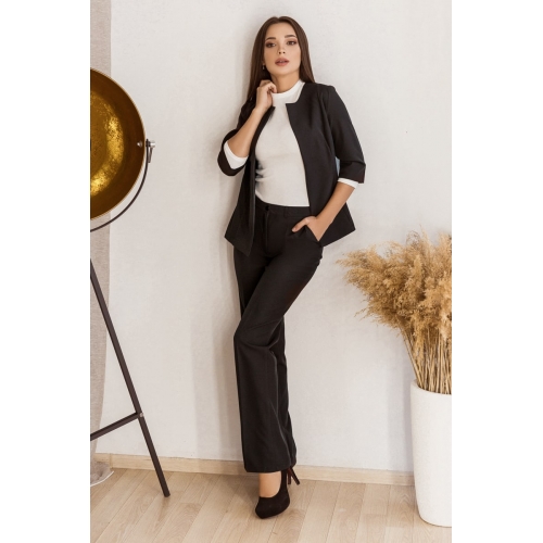 Стильний жіночий костюм із костюмної тканини середньої щільності. Штани середньою посадки прямого крою, застібаються на гудзик, ззаду на поясі резинка, що спрощує підбір розміру. Піджак прямий, не застібається.