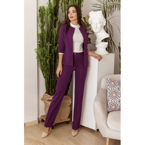 Стильний жіночий костюм із костюмної тканини середньої щільності. Штани середньою посадки прямого крою, застібаються на гудзик, ззаду на поясі резинка, що спрощує підбір розміру. Піджак прямий, не застібається.