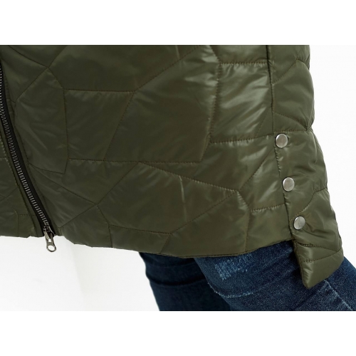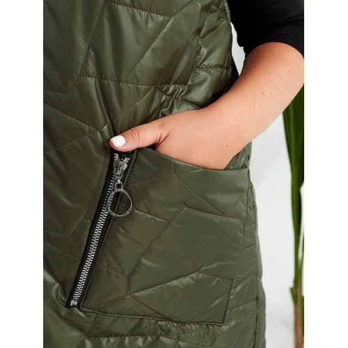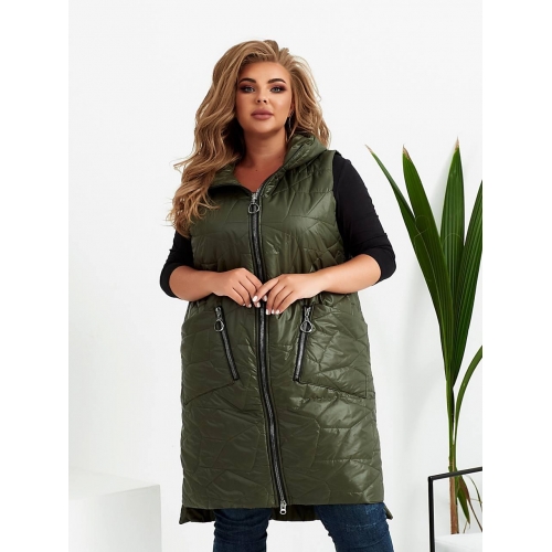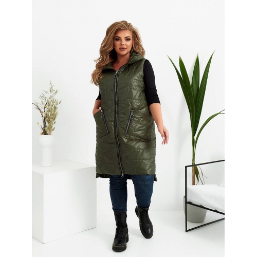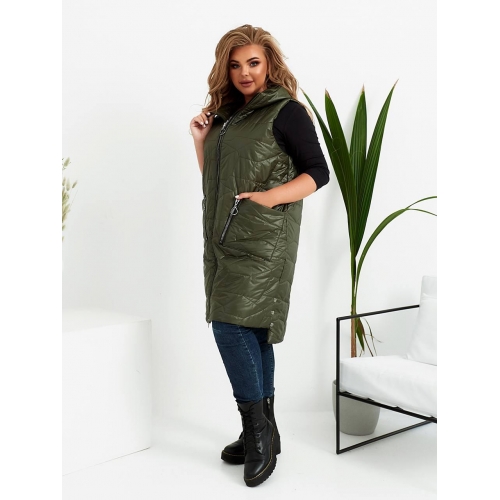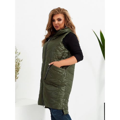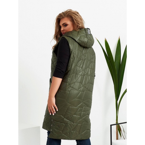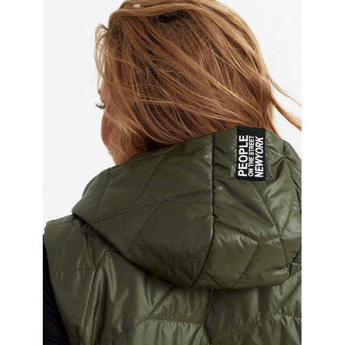 Стильна стьобана жилетка прямого крою з накладними кишенями, зручний глибокий капюшон, якісна фурнітура, нашивка