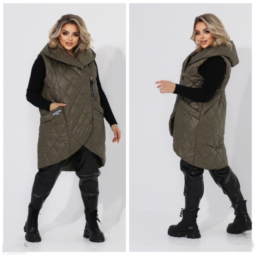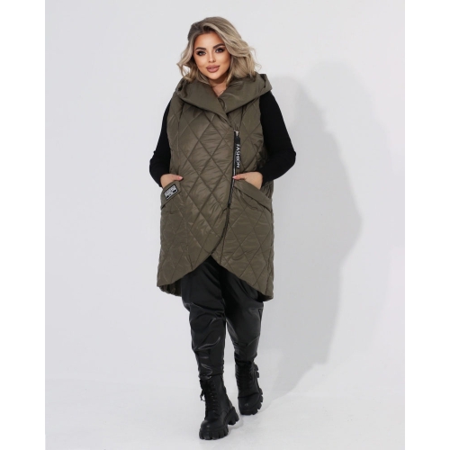 Стильна стегана жилетка прямого крою з кишенями, зручний глибокий капюшон, якісна фурнітура, нашивка.