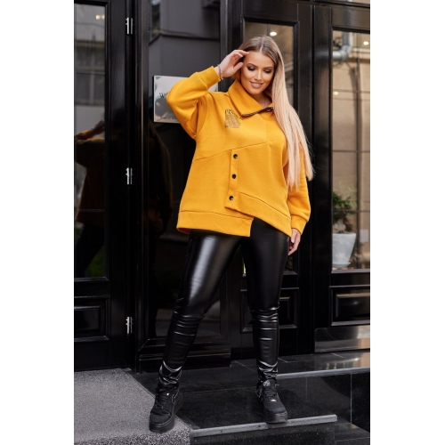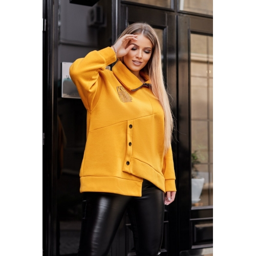 Батник з тринитки на флісі, має довгі рукави закінчуються манжетами в тон, на горловині вшита функціональна молнія, збоку прикрашен декоративними гудзиками.