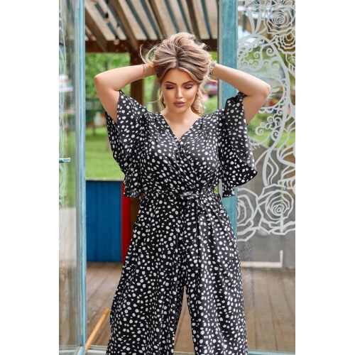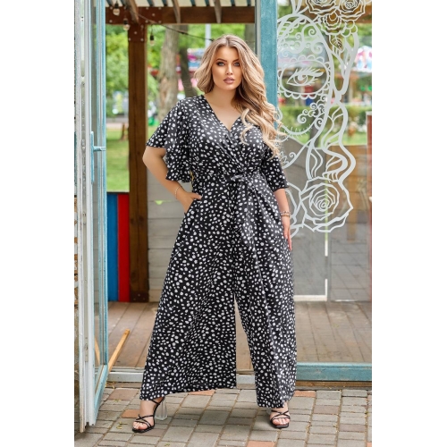 Деталі: А-силует, пишний рукав, глибоке декольте, відрізна лінія талії, штани-палаццо вільного крою з кишенями, застібка - потайна блискавка по спинці. До комбінезону додається пояс.