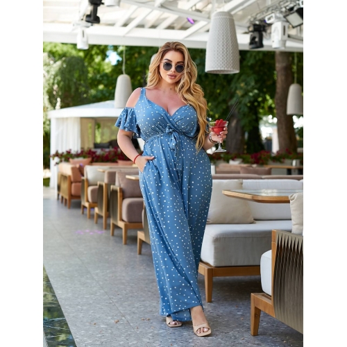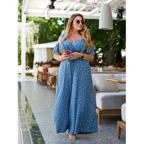 Деталі: А-силует, глибоке декольте, розкішні штани-палаццо з кишенями, пояс у комплекті.