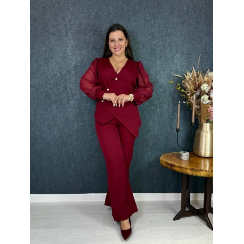 Жакет на ґудзиках, асиметрія по низу, рукава з шифону на манжетах. Штани приталеного крою, застібаються збоку на молнію, висока посадка.