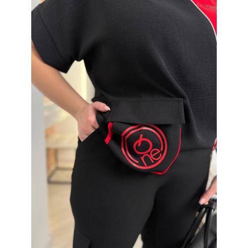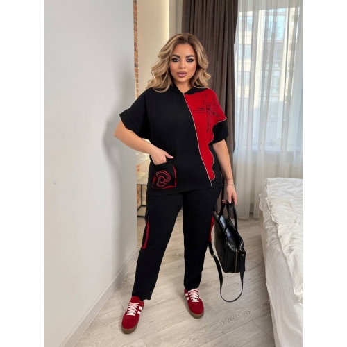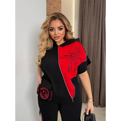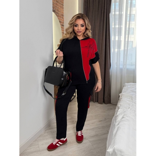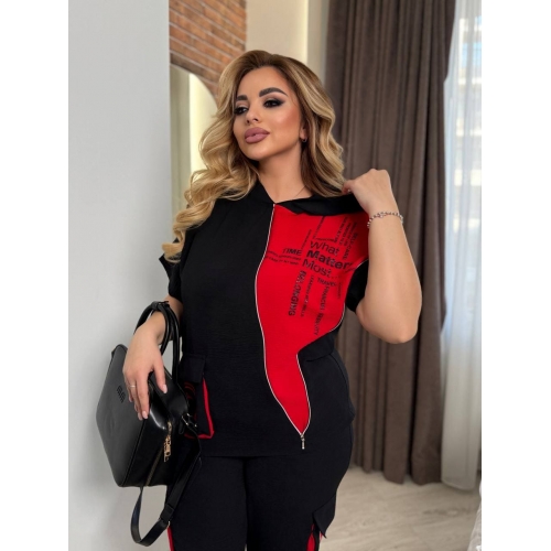 Костюм-двійка цікавого крою: молнія на грудях коригує обʼєм блузи ( можна застібати та розстібати ). Також вертикальна молнія на грудях робить силует більш витонченим, такий крій привертає увагу , є гарним елементом та прикрасою в даній моделі.
