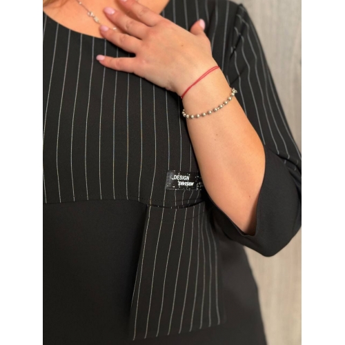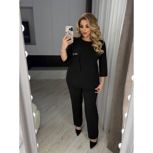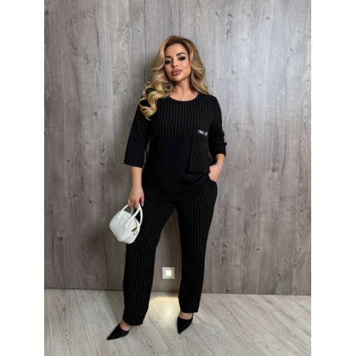 Елегантний костюм-двійка. Верх кофти з якісної полоски-тіар, низ з крепкостюмки, зліва карман з полоски, над карманом чорно-біла нашивка, що додає цікавості образу. Штани також з полоски на резинці. Костюм шткарно підійде як для заходів, так і на прогулянки