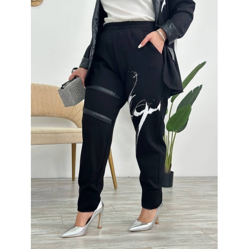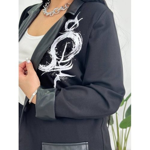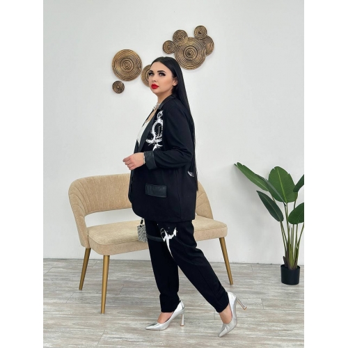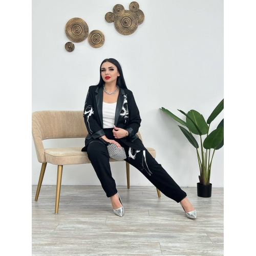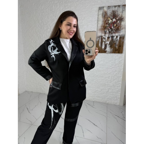 Стильний костюм-двійка : жакет застібається на ґудзик , на плечах «плечики» , по низу рукавів шкіряні вставки ( можна завернути рукав ), на рукаві та на грудях накат, з боків робочі кишені зі шкіри. Штани : висока посадка , на резинці , з боків кишені, на одні нозі на коліні шкіряні вставки , на інші нозі гарний накат , по низу шланга шкіряні вставки ( можна завернути ).