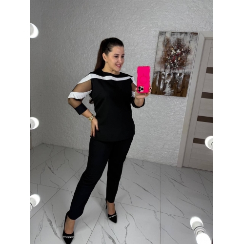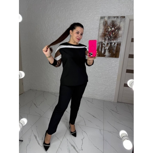 Нарядний костюм -двійка : блуза цікавого крою: декоративні смужки з сітки та білої тканини гарно поєднуються в хвилі , які переходять на рукава. Така цікава деталь підкреслить вашу фігуру та додасть елегантності образу . По спинці потайна молнія , з боків два розрізи, рукава нижче ліктя на манжеті .