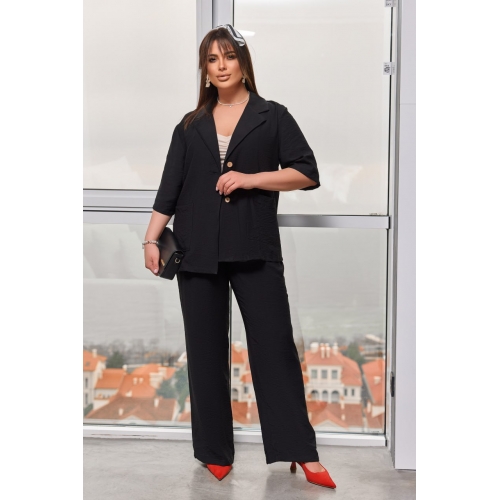 Стильний брючний костюм із льону. Штани середньої посадки, пояс на резинці, що спрощує підбір розміру. Піджак прямий із відкритим вирізом та рукавами 3/4, застібається на два гудзики