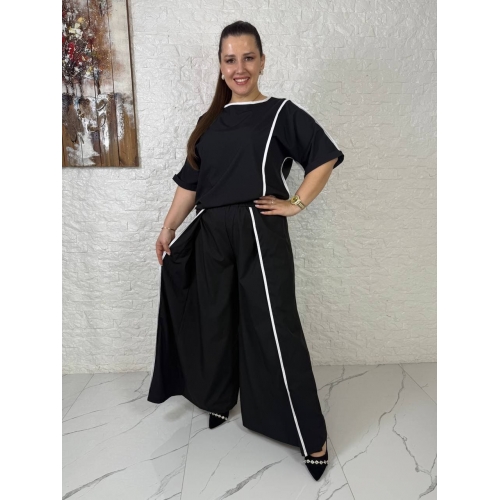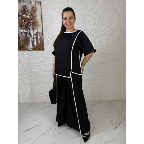 Костюм-двійка цікавого крою: штани імітація спідниці, блузки та штани оздоблені кантом, що підкреслює вашу фігуру та робить подовженим силует. Штани-кльош на гумці, висока посадка, спереду «нахльостує». Блуза з нерівним низом, рукав прикриває лікоть.