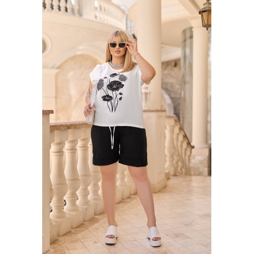 Блуза виконана з американського крепу ,вільного крою з куліскою знизу, з ексклюзивним накатом, шорти виконані з льону-вільні, високої посадки на резинці з бічними кишенями.