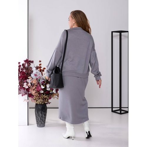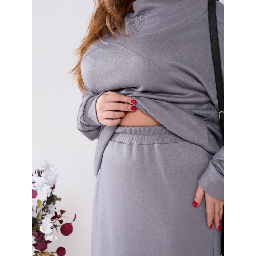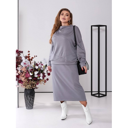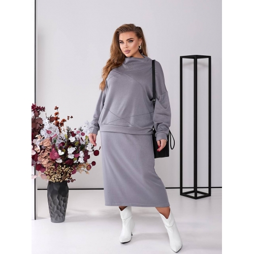 Кофта вільного крою з гарними перестрочками, горло декороване камінням. Спідниця прямого крою, резинка пояс.