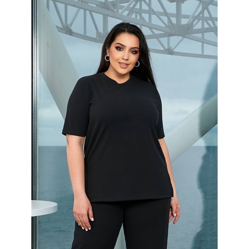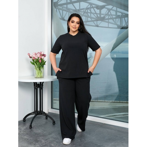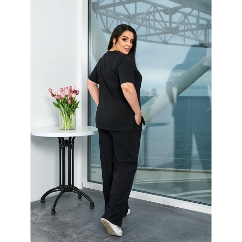 Деталі: подовжена футболка вільного крою з округлою горловиною та рукавом до ліктя. Брюки-палаццо на широкій резинці, з глибокими кишенями.