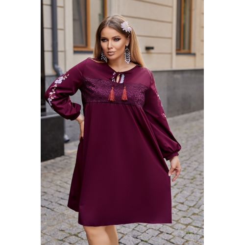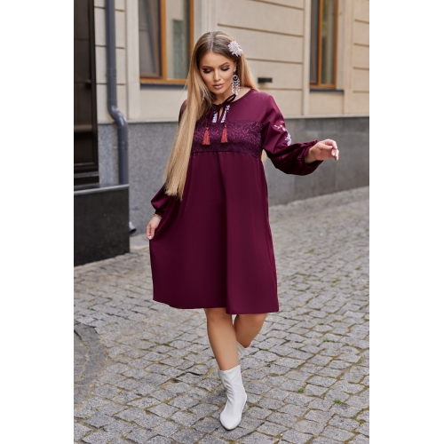 Сукня вільного крою з декоративними шнурками, вставкою з якісного гіпюру та квітковою аплікацією на рукавах.