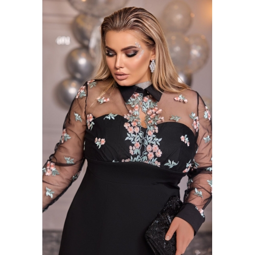 Приталена сукня з сорочковим коміром, довгі рукави закінчуються манжетами.
