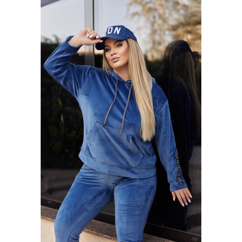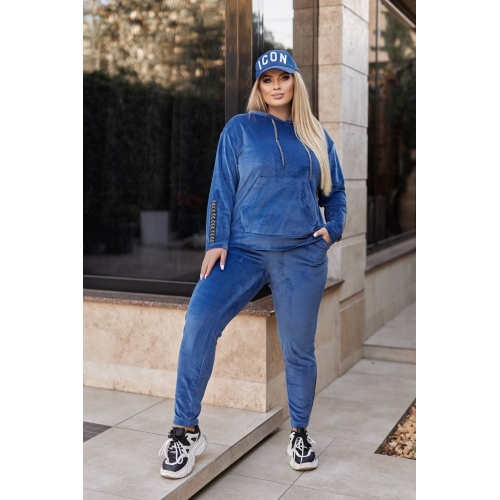 Худі з кишенею кенгуру, на рукавах і на штанах знизу нашивка стразами(принт стразами може змінюватися). Штани вільного крою, прямі, високої посадки, з кишенями. Розтяжність велюра +8 см.