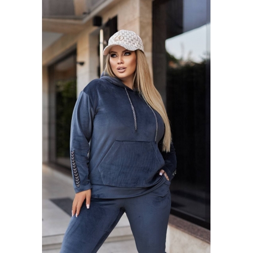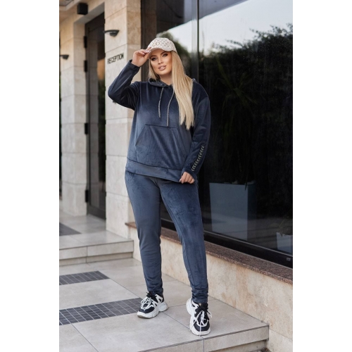 Худі з кишенею кенгуру, на рукавах і на штанах знизу нашивка стразами(принт стразами може змінюватися). Штани вільного крою, прямі, високої посадки, з кишенями. Розтяжність велюра +8 см.